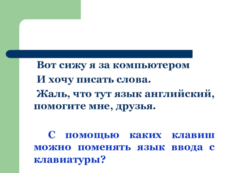Вот сижу я за компьютером	И хочу писать слова.	Жаль, что тут язык английский, помогите мне, друзья.			С помощью каких