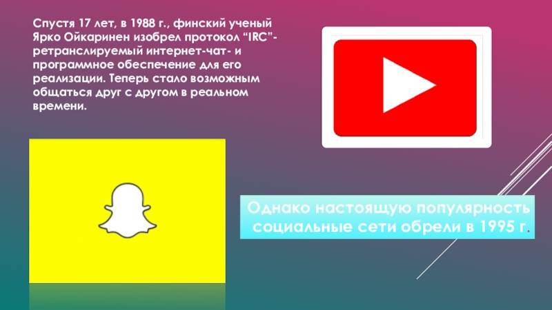 Первая социальная сеть с использование компьютерной техники появилась в 1971 г. Она использовалась военными для передачи информации через ARPANET.