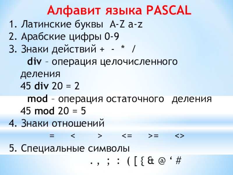 Алфавит языка PASCAL1. Латинские буквы A-Z a-z2. Арабские цифры 0-9З. Знаки действий + - * /