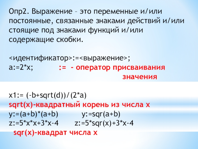 Слайд 5Опр2. Выражение – это переменные и/или постоянные, связанные знаками действий и/или