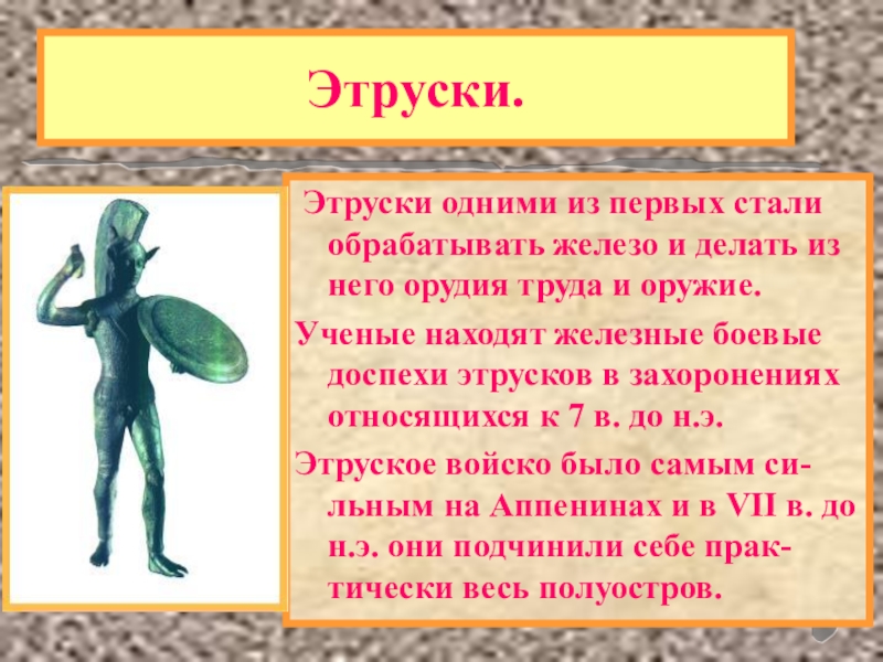Этруское войско было самым си-льным на Аппенинах и в VII в. до н.э. они подчинили себе прак-тически весь полуостров.