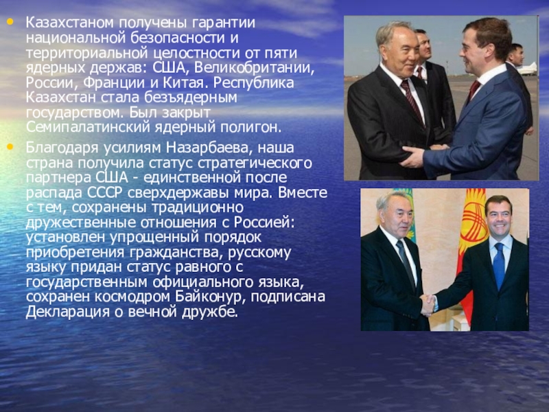 Благодаря усилиям Назарбаева, наша страна получила статус стратегического партнера США - единственной после распада СССР сверхдержавы мира. Вместе с тем, сохранены традиционно дружественные отношения с Россией: установлен упрощенный порядок приобретения гражданства, русскому языку придан статус равного с государственным официального языка, сохранен космодром Байконур, подписана Декларация о вечной дружбе.