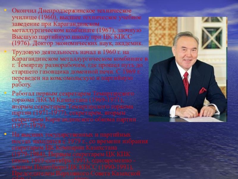 Слайд 16Окончил Днепродзержинское техническое училище (1960), высшее техническое учебное заведение при Карагандинском