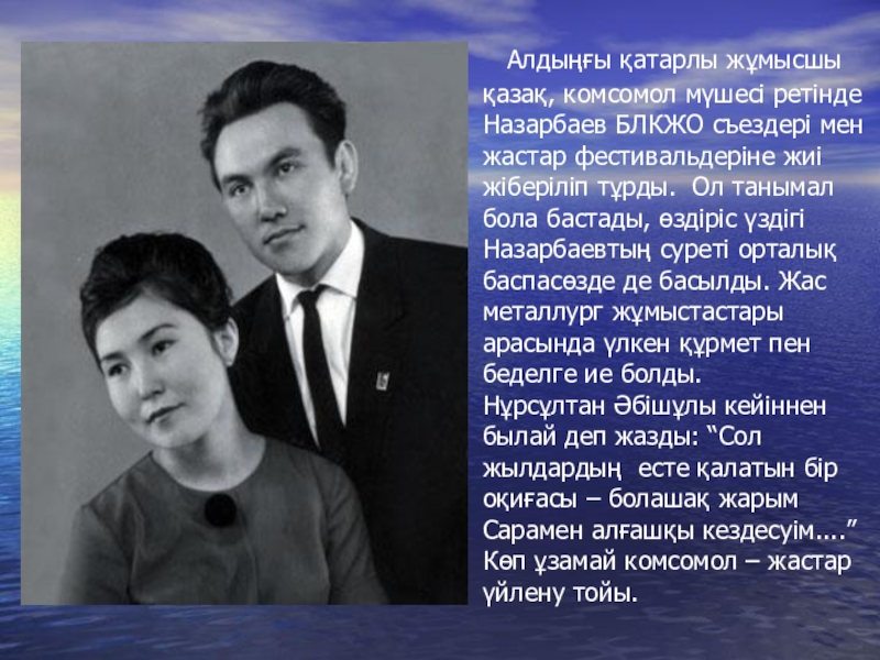 Нұрсұлтан Әбішұлы кейіннен былай деп жазды: “Сол жылдардың есте қалатын бір оқиғасы – болашақ жарым Сарамен алғашқы кездесуім....” Көп ұзамай комсомол – жастар үйлену тойы.