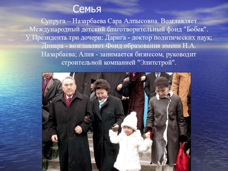 Супруга – Назарбаева Сара Алпысовна. Возглавляет Международный