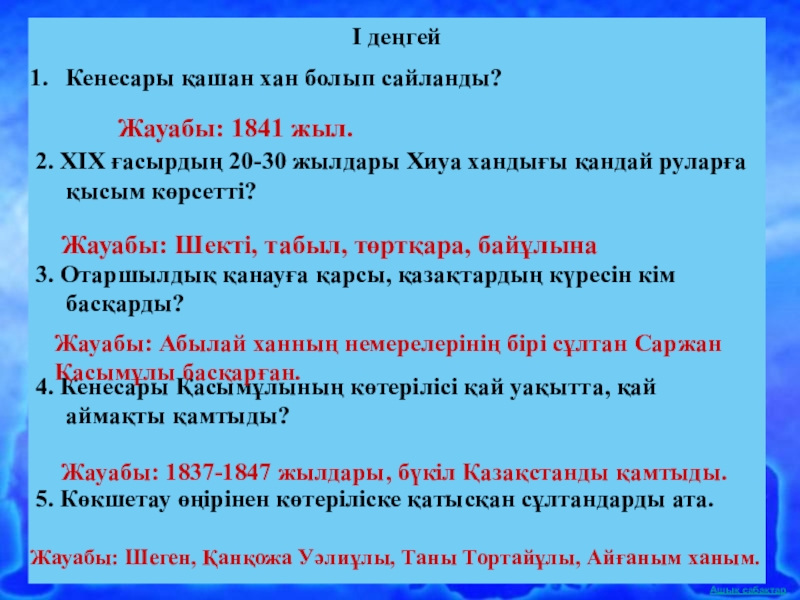 Жауабы: Шеген, Қанқожа Уәлиұлы, Таны Тортайұлы, Айғаным ханым.