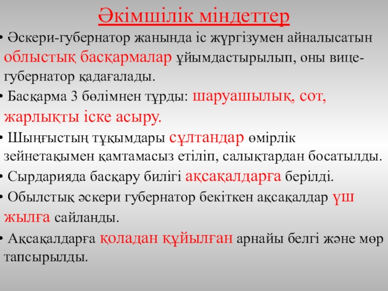 дайындалды: өзіндік ауыртпалықтар, жерді иелену түрлері, сот ісі, ағарту ісі, салық, діни мәселе т.б.