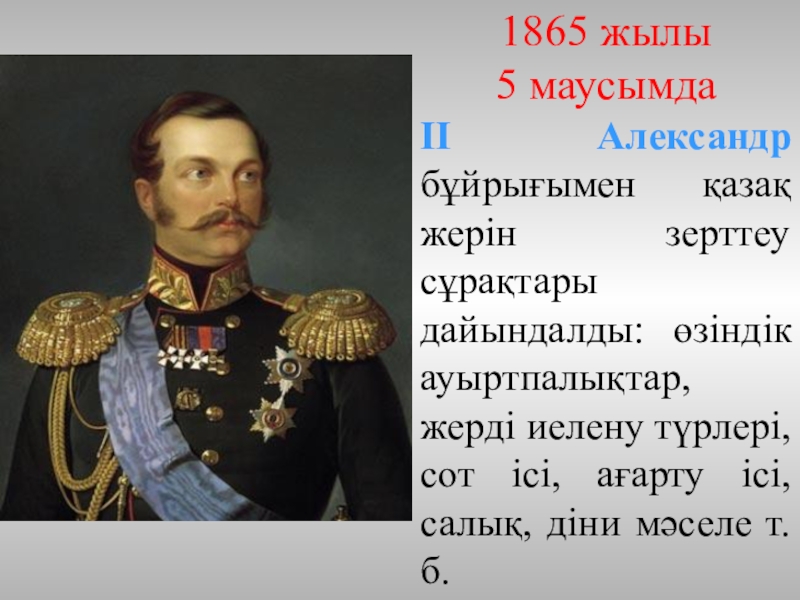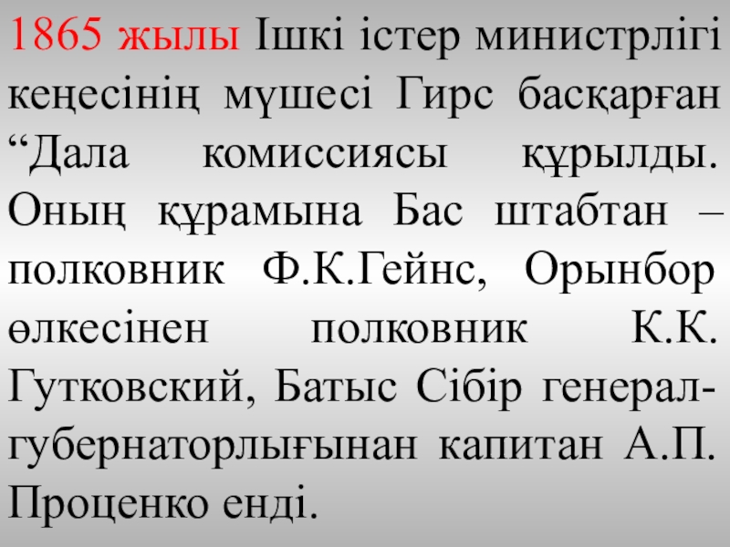 Слайд 31865 жылы Ішкі істер министрлігі кеңесінің мүшесі Гирс басқарған “Дала комиссиясы