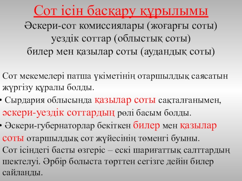 Сот мекемелері патша үкіметінің отаршылдық саясатын жүргізу құралы болды.