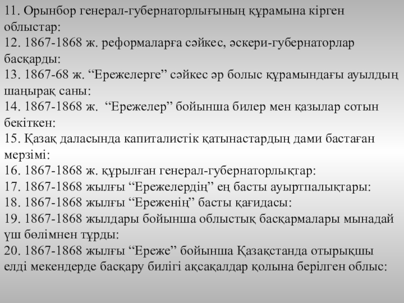 Слайд 2121. 1867-1868 жылғы “Ережеден” кейін Қазақстанның Закаспий облысына өткен жері: