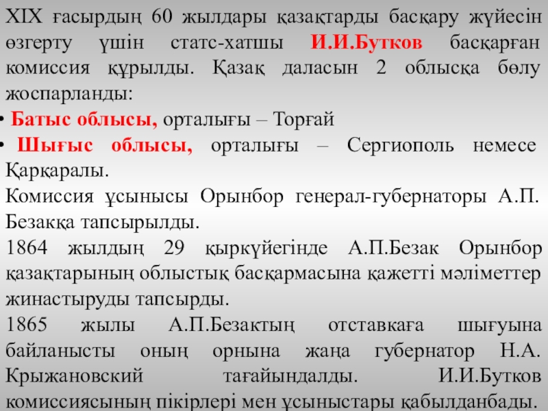 Слайд 2ХІХ ғасырдың 60 жылдары қазақтарды басқару жүйесін өзгерту үшін статс-хатшы И.И.Бутков