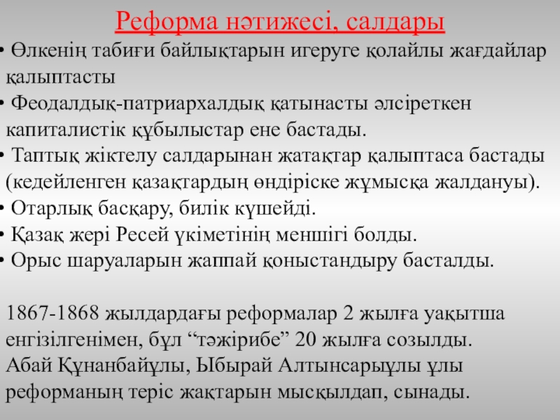 1867-1868 ж.ж. реформа Ресейде басыбайлық құқығының жойылуымен тұстас келді.