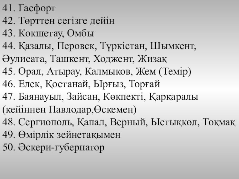 44. Қазалы, Перовск, Түркістан, Шымкент,