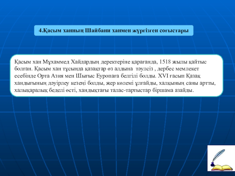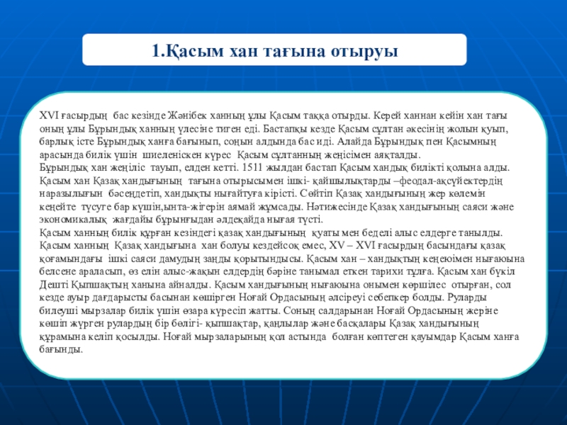 Қасым ханның қазақ хандығын күшейту, қазақ тайпаларын және қазақтардың этникалық территориясын біріктіру жолындағы жеңістері елдің ішкі және сыртқы беделін арттырып, атақ – даңқын асыра түсті. Әйгілі (орта ғасырлық) тарихшы Мұхаммед Хайдар Дулати («Тарихи – Рашиди») атты кітабында: «Қазақ хандары мен сұлтандары арасында Қасым хандай құдіретті ешкім болған емес. Бұрындықты тіпті ешкім де елең қылған жоқ» - дейді.