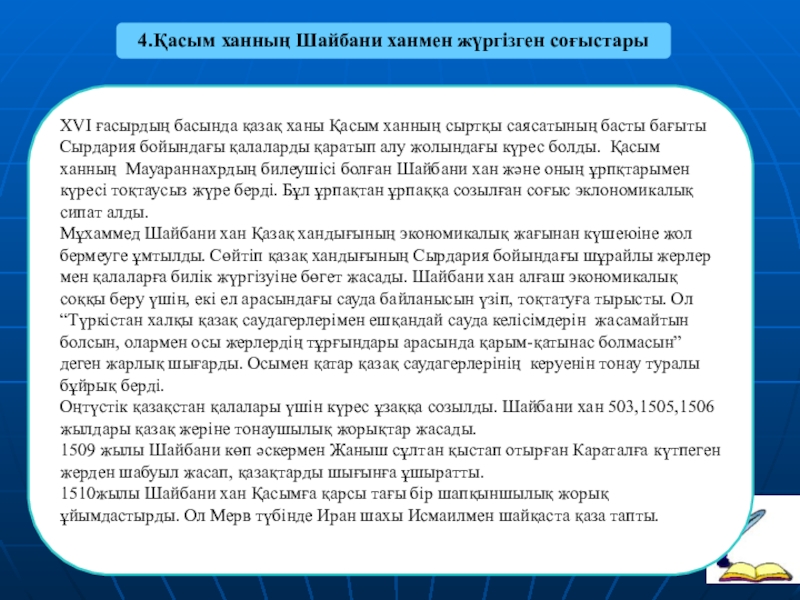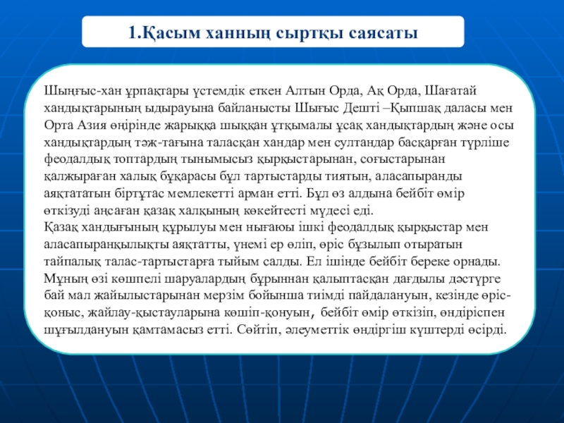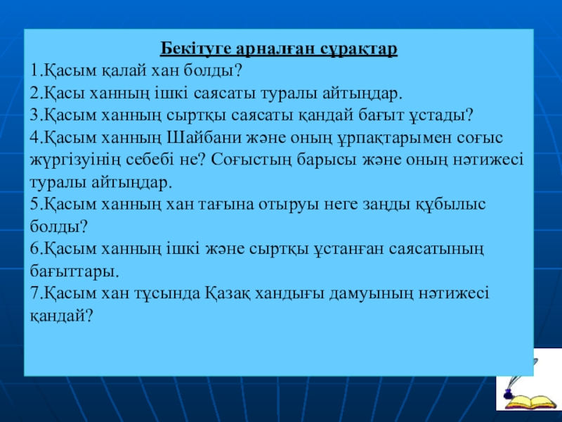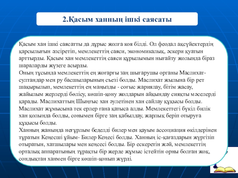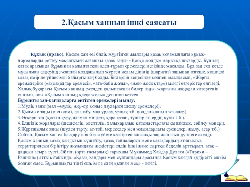 5.Жұртшылық заңы (шүлен тарту, ас-той, мерекелер мен жиындардағы ережелер, жылу, асар т.б.) Сөйтіп, Қасым хан ел басқару ісін бір жүйеге келтірген алғашқы заң жинағын дүниеге әкелді.