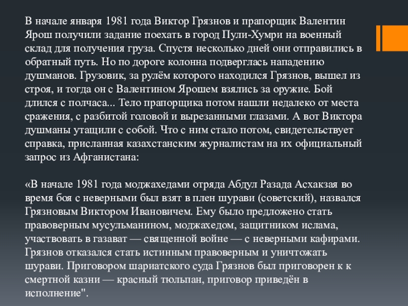 получили задание поехать в город Пули-Хумри на военный склад для получения груза. Спустя несколько дней они отправились в обратный путь. Но по дороге колонна подверглась нападению душманов. Грузовик, за рулём которого находился Грязнов, вышел из строя, и тогда он с Валентином Ярошем взялись за оружие. Бой длился с полчаса... Тело прапорщика потом нашли недалеко от места сражения, с разбитой головой и вырезанными глазами. А вот Виктора душманы утащили с собой. Что с ним стало потом, свидетельствует справка, присланная казахстанским журналистам на их официальный запрос из Афганистана: