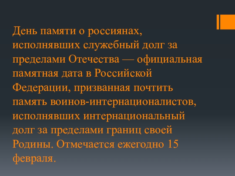 Слайд 31День памяти о россиянах, исполнявших служебный долг за пределами Отечества —