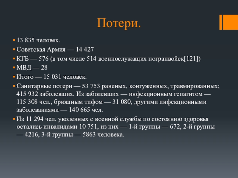 Санитарные потери — 53 753 раненых, контуженных, травмированных; 415 932 заболевших. Из заболевших — инфекционным гепатитом — 115 308 чел., брюшным тифом — 31 080, другими инфекционными заболеваниями — 140 665 чел.