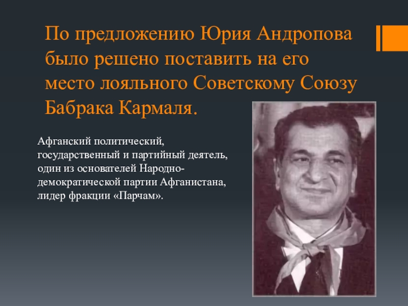 Слайд 10По предложению Юрия Андропова было решено поставить на его место лояльного