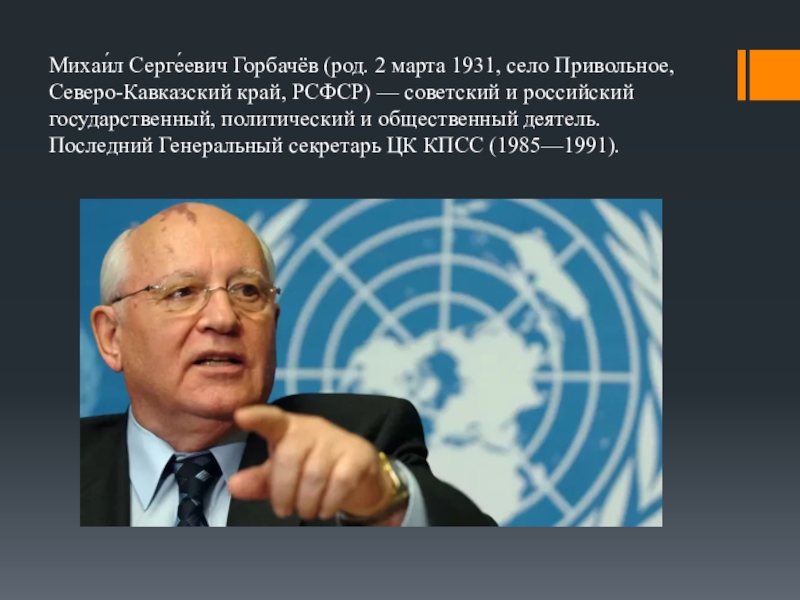 Слайд 19Михаи́л Серге́евич Горбачёв (род. 2 марта 1931, село Привольное, Северо-Кавказский край,