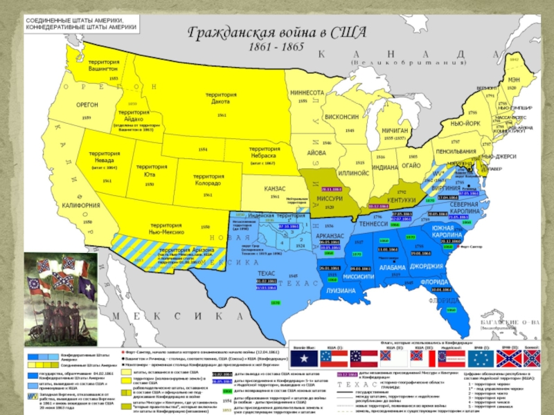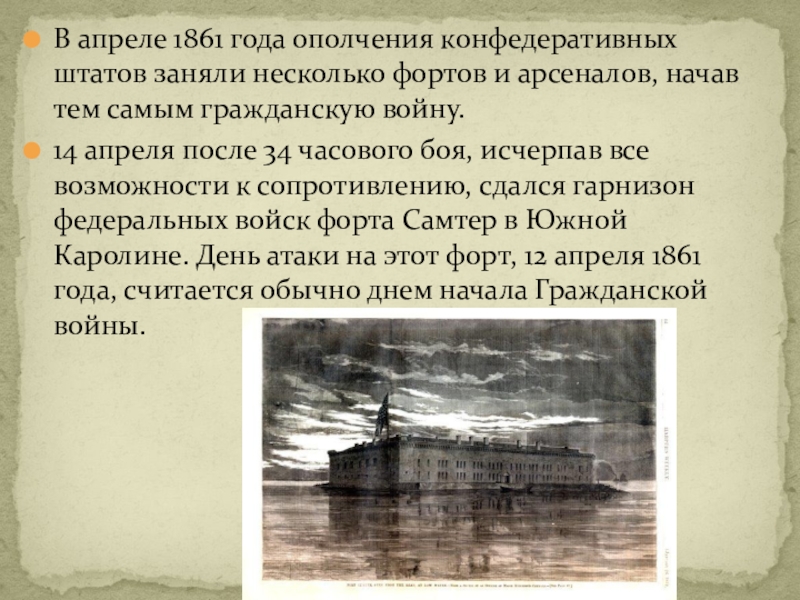 Слайд 20В апреле 1861 года ополчения конфедеративных штатов заняли несколько фортов и