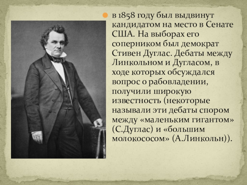 Слайд 13в 1858 году был выдвинут кандидатом на место в Сенате США.