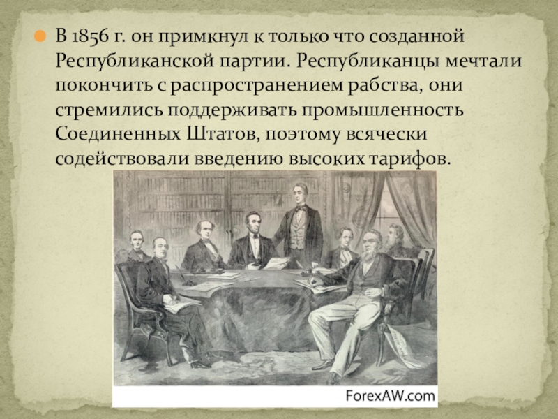 Слайд 12В 1856 г. он примкнул к только что созданной Республиканской партии.
