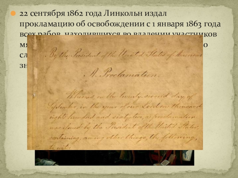 Слайд 2622 сентября 1862 года Линкольн издал прокламацию об освобождении с 1