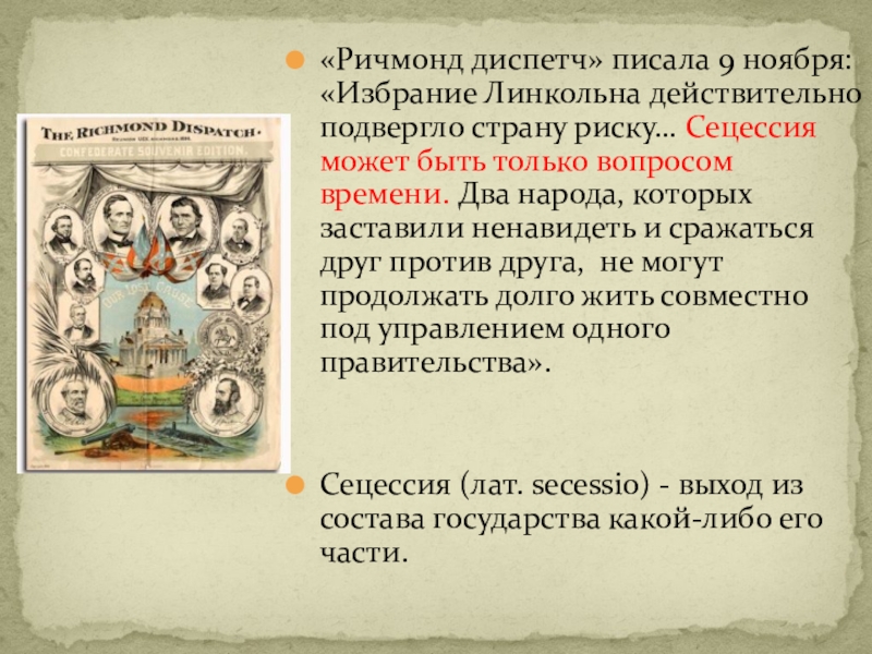 Слайд 18«Ричмонд диспетч» писала 9 ноября: «Избрание Линкольна действительно подвергло страну риску…