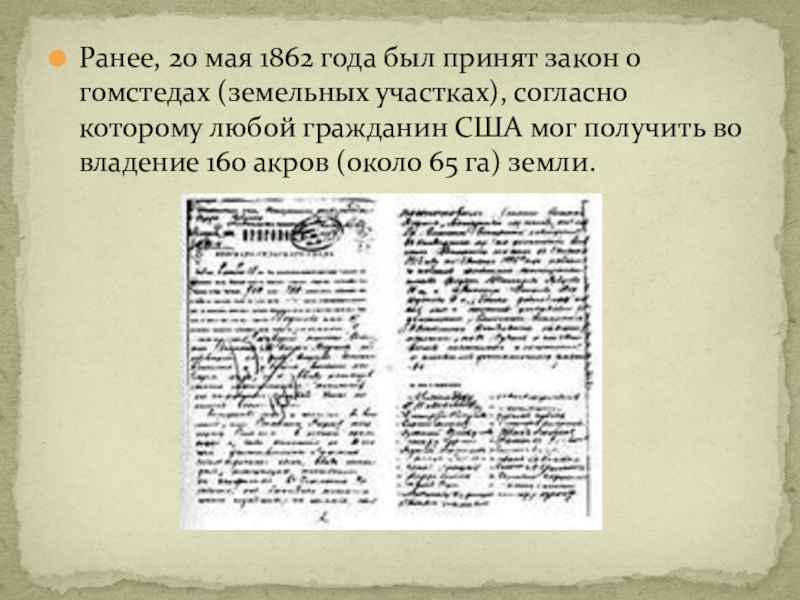 Слайд 27Ранее, 20 мая 1862 года был принят закон о гомстедах (земельных