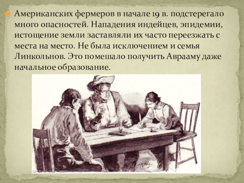 эпидемии, истощение земли заставляли их часто переезжать с места на место. Не была исключением и семья Линкольнов. Это помешало получить Аврааму даже начальное образование.