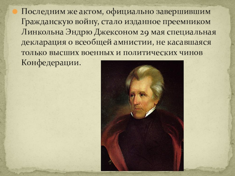 Слайд 32Последним же актом, официально завершившим Гражданскую войну, стало изданное преемником Линкольна