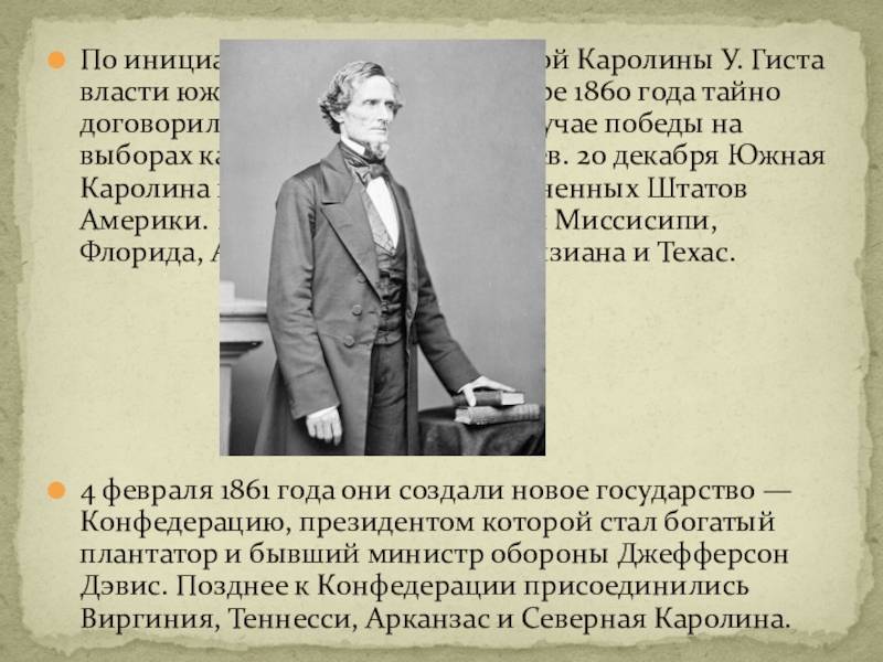 в октябре 1860 года тайно договорились выйти из союза в случае победы на выборах кандидата республиканцев. 20 декабря Южная Каролина первой вышла из Соединенных Штатов Америки. Ее примеру последовали Миссисипи, Флорида, Алабама, Джорджия, Луизиана и Техас.