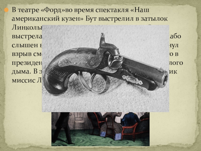 затылок Линкольна со словами «смерть тирану». Звук выстрела маленького медного пистолета был слабо слышен в зале, тем более что в этот момент грянул взрыв смеха. Присутствовавшие сообразили, что в президента стреляли, только увидев облачко белого дыма. В этот момент на весь театр прозвучал крик миссис Линкольн: «Он застрелил президента!»