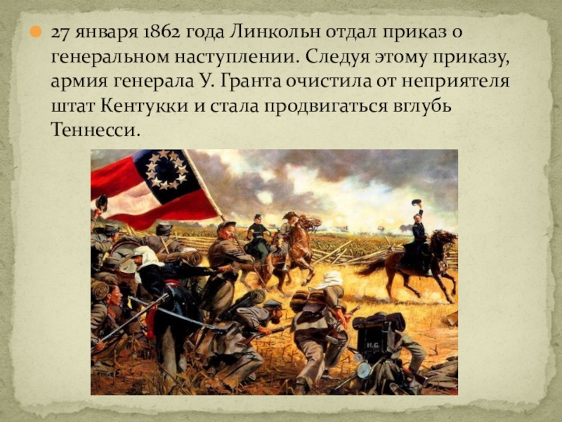 Слайд 2327 января 1862 года Линкольн отдал приказ о генеральном наступлении. Следуя