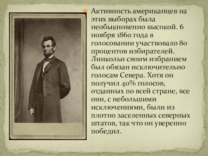 Слайд 16Активность американцев на этих выборах была необыкновенно высокой. 6 ноября 1860