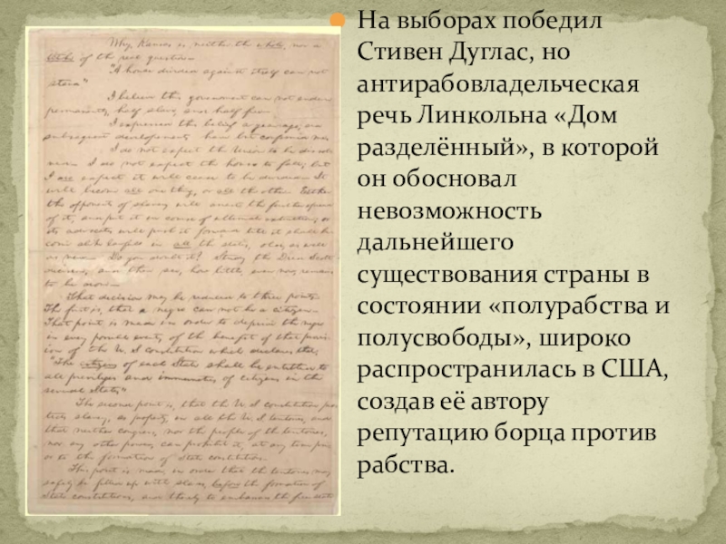 Слайд 14На выборах победил Стивен Дуглас, но антирабовладельческая речь Линкольна «Дом разделённый»,