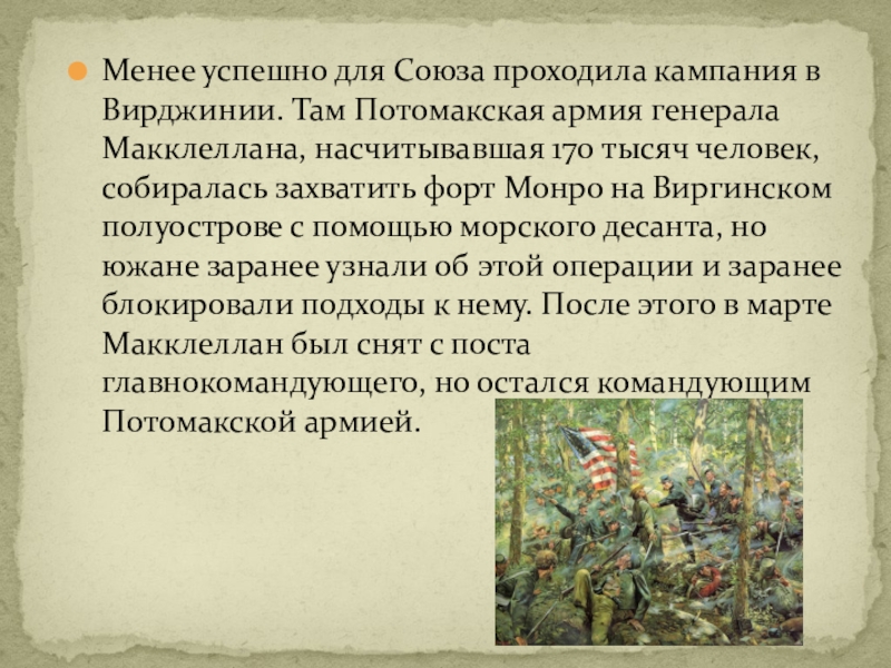 генерала Макклеллана, насчитывавшая 170 тысяч человек, собиралась захватить форт Монро на Виргинском полуострове с помощью морского десанта, но южане заранее узнали об этой операции и заранее блокировали подходы к нему. После этого в марте Макклеллан был снят с поста главнокомандующего, но остался командующим Потомакской армией.