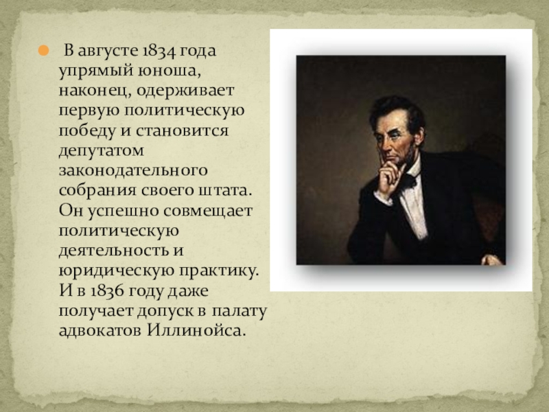 победу и становится депутатом законодательного собрания своего штата. Он успешно совмещает политическую деятельность и юридическую практику. И в 1836 году даже получает допуск в палату адвокатов Иллинойса.