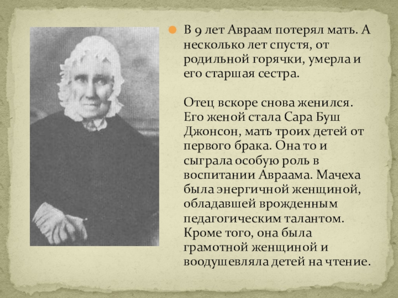 Слайд 6В 9 лет Авраам потерял мать. А несколько лет спустя, от