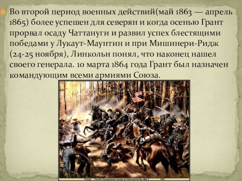 северян и когда осенью Грант прорвал осаду Чаттануги и развил успех блестящими победами у Лукаут-Маунтин и при Мишинери-Ридж (24-25 ноября), Линкольн понял, что наконец нашел своего генерала. 10 марта 1864 года Грант был назначен командующим всеми армиями Союза.