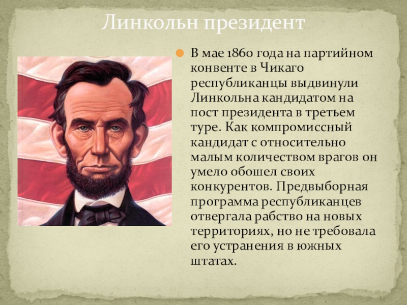Линкольна кандидатом на пост президента в третьем туре. Как компромиссный кандидат с относительно малым количеством врагов он умело обошел своих конкурентов. Предвыборная программа республиканцев отвергала рабство на новых территориях, но не требовала его устранения в южных штатах.