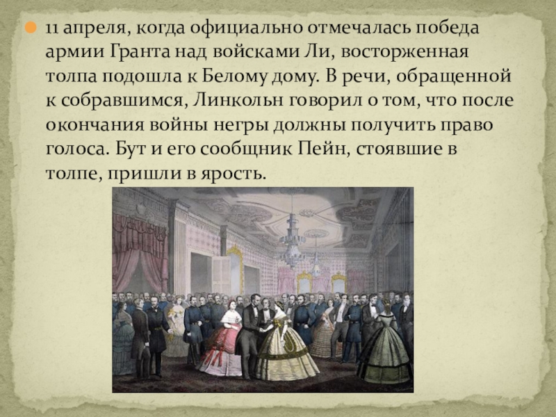 восторженная толпа подошла к Белому дому. В речи, обращенной к собравшимся, Линкольн говорил о том, что после окончания войны негры должны получить право голоса. Бут и его сообщник Пейн, стоявшие в толпе, пришли в ярость.