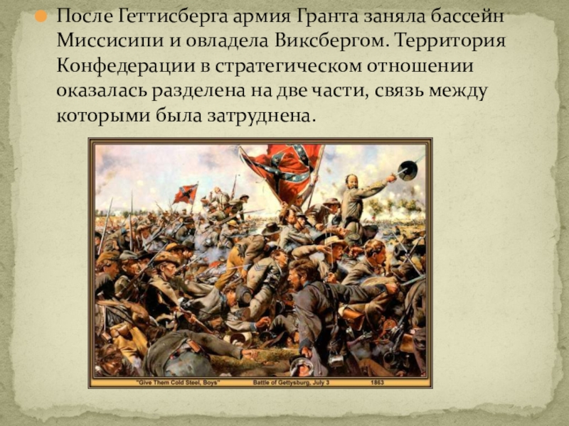 Слайд 29После Геттисберга армия Гранта заняла бассейн Миссисипи и овладела Виксбергом. Территория
