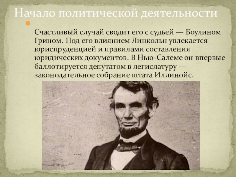влиянием Линкольн увлекается юриспруденцией и правилами составления юридических документов. В Нью-Салеме он впервые баллотируется депутатом в легислатуру — законодательное собрание штата Иллинойс.