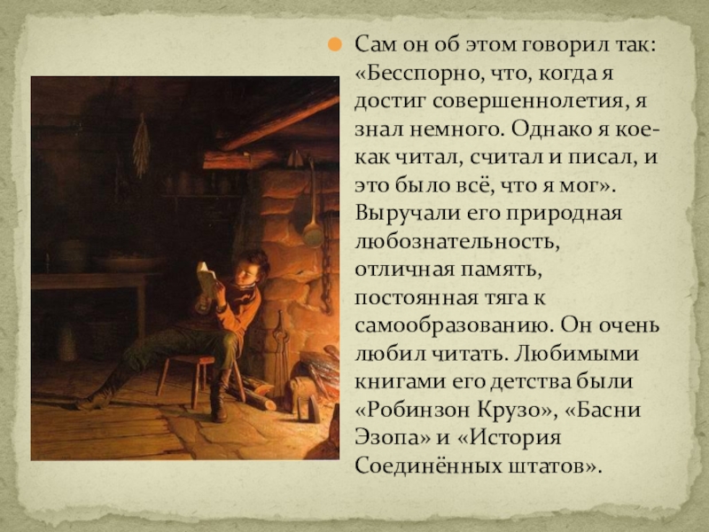 совершеннолетия, я знал немного. Однако я кое-как читал, считал и писал, и это было всё, что я мог». Выручали его природная любознательность, отличная память, постоянная тяга к самообразованию. Он очень любил читать. Любимыми книгами его детства были «Робинзон Крузо», «Басни Эзопа» и «История Соединённых штатов».