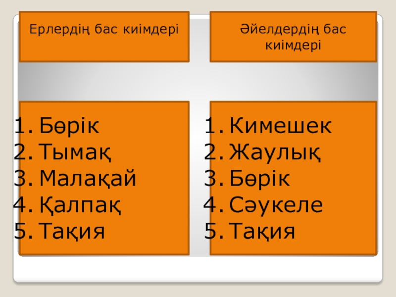 БөрікТымақМалақайҚалпақТақияКимешекЖаулықБөрікСәукелеТақияЕрлердің бас киімдеріӘйелдердің бас киімдері
