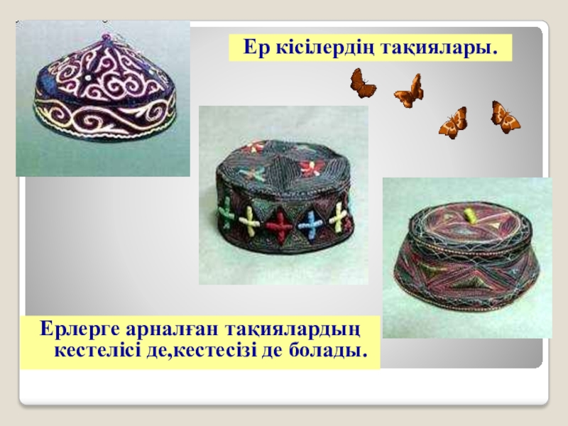 Слайд 6Ерлерге арналған тақиялардың кестелісі де,кестесізі де болады.