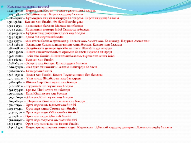 Қазақ хандарының кестесі 1456-1473ж – Керей хан. Керей – Болат сұлтанның баласы. 1473-1480ж – Жәнібек хан –