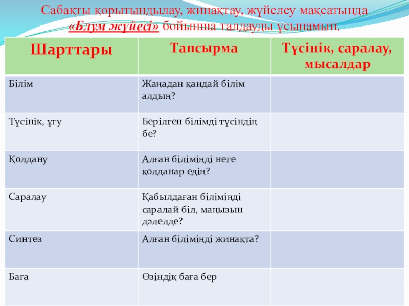 «Блум жүйесі» бойынша талдауды ұсынамын.